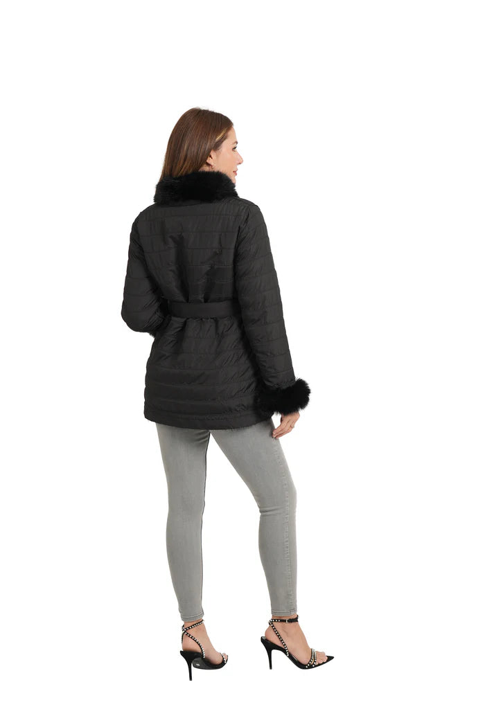 Jen reversible faux fur long jacket, magnetic button closure, slit pockets, wrap belt, relaxed fit. Materials: 100% Polyester Model Is...
