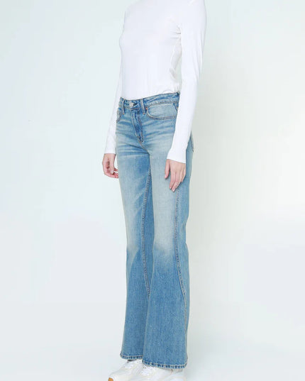 Vintage medium wash jeans with a slimming flare silhouette, featuring soft curves on both the inseam and outseam that gently...