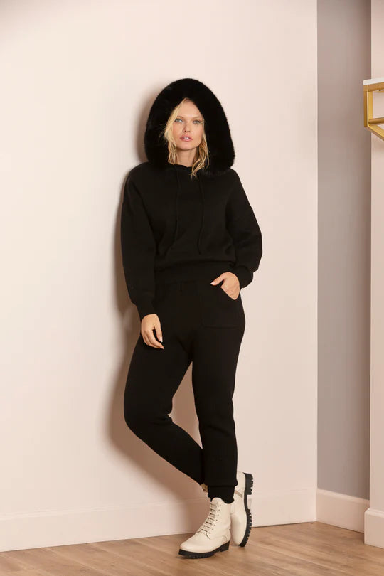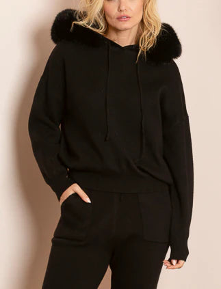 Color: Black. Trim: Faux Fur. Madilyn Wool Blended Hooded Sweater with Detachable Faux Fur Trim.